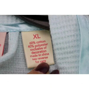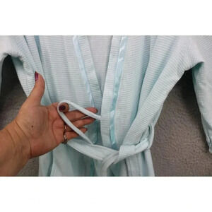 This is a Coral Bay Women's Light Blue Bath Robe that is a size XL. It is belted and has pockets. It is 60% Cotton and 40% Polyester. Laying flat, it measures: Armpit to armpit-20.5" and the length is 32.5". It has satin trim. The material is like a waffle knit and is very soft. In great condition.