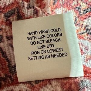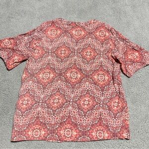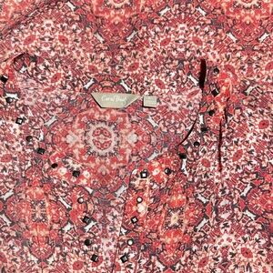 Pre-owned Coral Bay short sleeve top in red multicolor geometric print. Features black stud accents on the front, v-neckline, and relaxed fit.