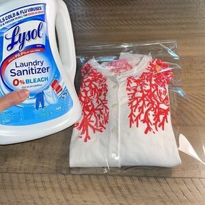💯 Cotton. Carefully cleaned with Lysol Laundry Sanitizer and stored sealed see measurements in pictures. Tiny imperfection but not noticeable see pics. Priced accordingly. So cute.