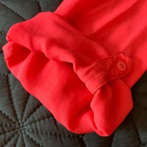 Flowy coral blouse from H&M with two chest pockets, front buttons, and roll-up sleeves.