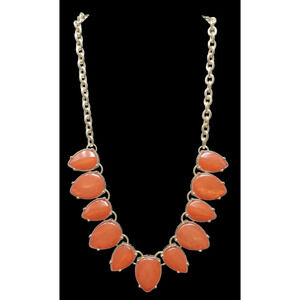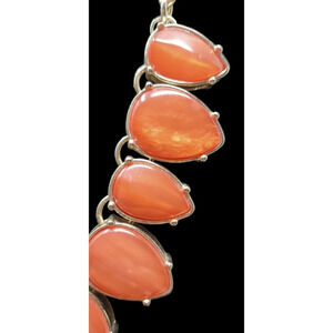 A pretty but bold coral colored statement Necklace has deep set teardrop cabochons that have a pearlescent look.
