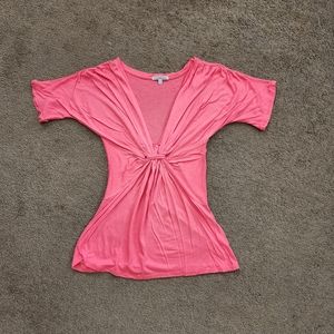 ◽️ Coral pink short-sleeved deep-v bunched front tunic top