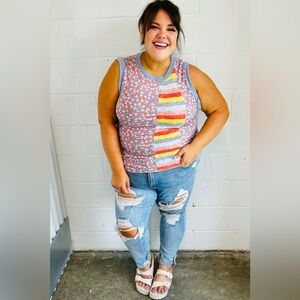 Slip on this eye catching loose fit tank top designed with french terry floral print and multicolor horizontal stripes. With a round neck, step into warm weather with style!