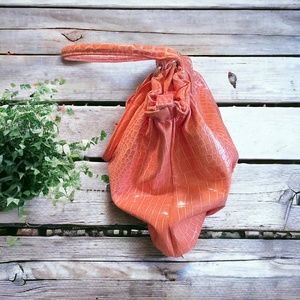 This pretty Springtime bag is coral vinyl embossed with an alligator print. With an inside zippered pocket and zipper top closure.