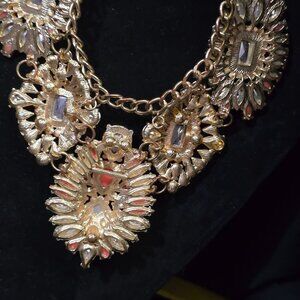In a world where jewelry speaks louder than words, this statement necklace emerges as the protagonist of elegance. Its coral and gold hues blend harmoniously, whispering tales of grace and grandeur. Adorned with rhinestones, it captures light and attention alike, creating a symphony of sparkle and sophistication.