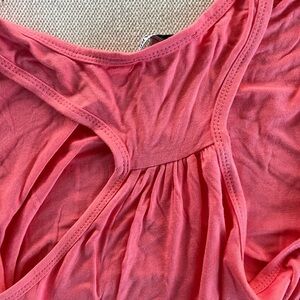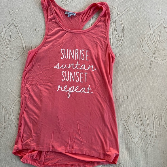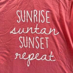 Soft coral racerback tank with white scripted graphic reading "Sunrise suntan Sunset repeat." Lightweight and breathable for warm-weather wear. Easy to pair with shorts or layered under a cardigan. Casual everyday staple in coral.