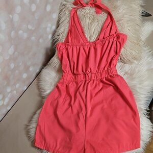 Cute tie neck halter romper in great condition with no known flaws. Lightweight polyester fabric has a nylon feel and drapes nicely. Oh, and POCKETS! Short 1" inseam. Elastic across the back. You can wear a halter style bra with this. Color is a little lighter than the pics show. No size tag but measures as a small.