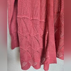 Stylish coral open-front cardigan with textured knit design. Perfect for layering.