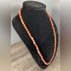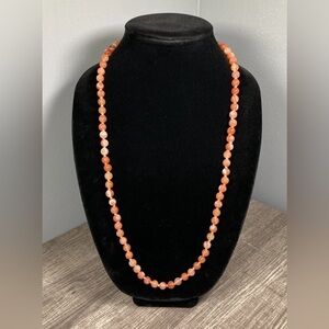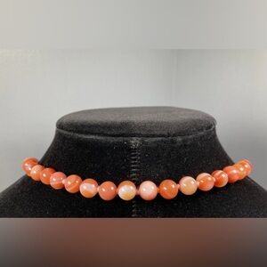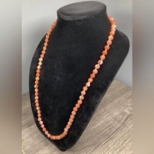 Coral Orange Stone Necklace Banded Agate Round Bead Hand Tied 30” Vintage. This is in excellent condition. The beads have a diameter roughly 8.45mm. The stones are hand tied between knots on multiple strands of pink string. This is well made and absolutely gorgeous. Please message me prior to purchase with any questions. Thank you!