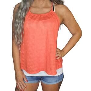 Coral Pink Tank Top Womens Medium Orange Knit Crochet Burnout Summer Flowy Boho