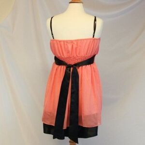 Coral pink chiffon dress, with shirring at the waist and a black satin sash. Fully lined.