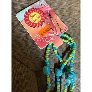 High gloss turquoise stone and lime green beading with silver and clear green spacers. Made with high quality elastic cording. US shoe Size: Large 9 - 10. Model is wearing size Medium.
