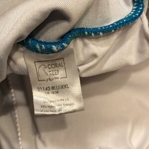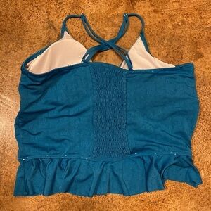 Coral Reef teal blue high low toe front peplum ruffle hem bikini swim top. EUC, great condition, size XXL, lined, padded cups, adjustable straps, see pictures for details.
