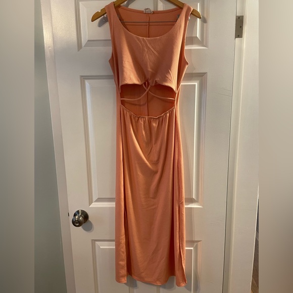 Coral ribbed dress with stretch. Very comfortable and can be worn as a maternity dress as well.
