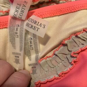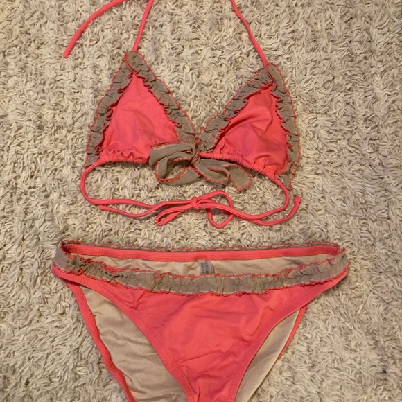 Stylish coral bikini with ruffle details. Halter top with tie closure. Matching bottoms with ruffle trim.