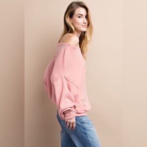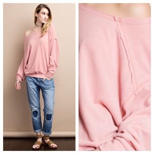 Unbelievably Soft!!! I'm in love with this top, perfect lightweight brushed knit, fuzzy soft to keep you warm. Perfect loose fit and drop sleeve in a beautiful coral. Can be worn on both shoulders or draping off one shoulder. Generous Amount of Strech.
