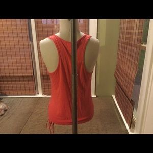 Coral blouse with elastic waist and cute tie on side. Cream colored Lace detail around neckline.