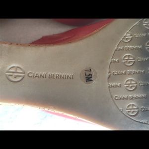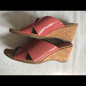 A beautiful pair of coral patent leatherette wedges. The 3” wedges are cork lined making the shoes very light weight. The shoes are comfortable and in very good condition.
