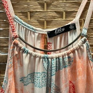 Embrace the ocean vibe with this coral and blue starfish print dress. Perfect for a casual day out or a beach getaway. Like New! Beautiful gold accent in front.