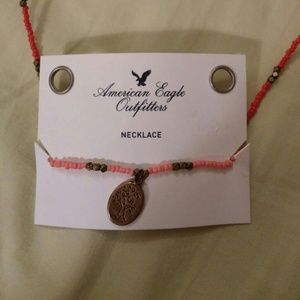 Coral and pink beads accented by gold tone. Small oval copper/gold pendant with carved tree. ~16" long.