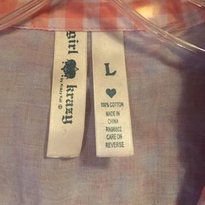 Coral and white plaid long sleeve. Never worn. Runs small. It's a large but I fit into medium or small.
