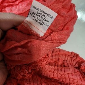 A vibrant coral strapless sundress with a fitted bodice, A-line silhouette, and delicate lace fabric featuring a floral pattern.