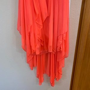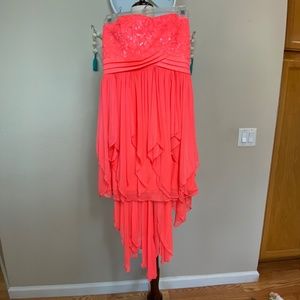 Gorgeous dressy coral colored strapless dress with sequins. Has layers flowing around the hem. Short skirt lining underneath.