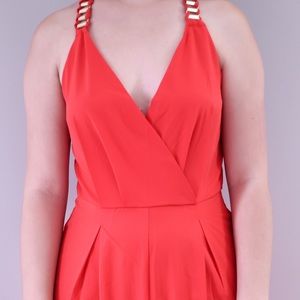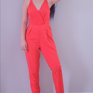 Coral jumpsuit with gold rings on each shoulder strap. Jumpsuit ends in peg pants fashion. Small medium large available. Black also in stock. Available in Small medium large
