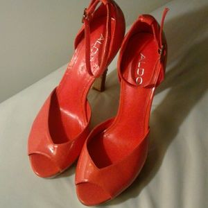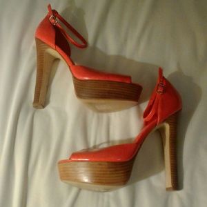 Patent leather coral peep toe' s with wooden platform heels. WORN ONCE. Right heel slightly damaged due to puppy training. Hardly noticeable.