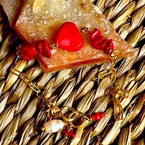 Coral rosary link chain hearts /adjustable charm dainty silver bracelet/