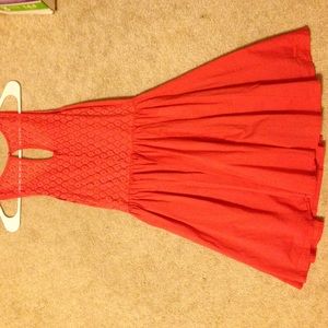 Beautiful short coral dress with some lace on the back. Great with or with out a belt. Heels flats or cowgirl boots. Worn once to a concert