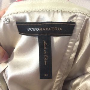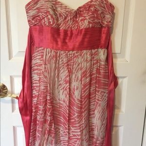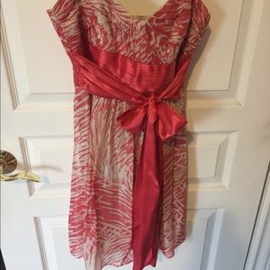 Strapless coral and cream patterned dress. Silk sash around the waist that can be tied in a bow or flush. From BCBG, only worn once to a formal dance so it's in perfect condition. Perfect for parties, formals, homecoming and/or weddings! size small/4