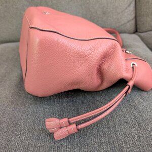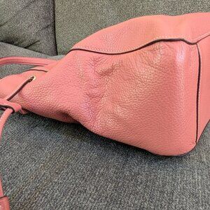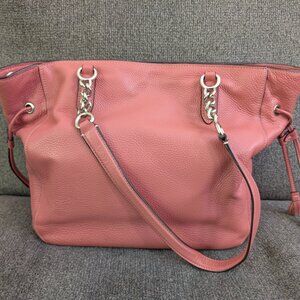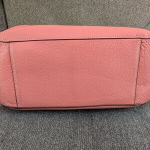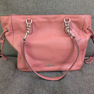 Beautiful coral/salmon leather Coach carryall shoulder bag with silver-toned hardware. Interior has two pockets, one the front and one on the back large enough to fit a 3.25" x 6" cell phone. Bag is in overall good condition with minimal wear and tear and no staining on the interior.