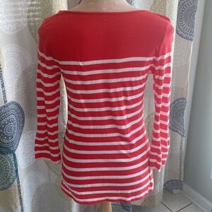 Coral & White, striped top. Quarter Length sleeves. Womens S.