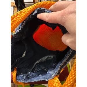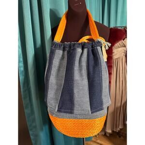 Unique skirted denim and paracord bucket bag. Great for traveling or outings. Pockets inside with drawstring closure. Made of upcycled denim and paracord rope.