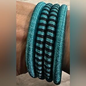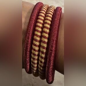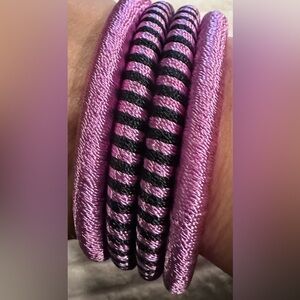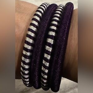 Each set has 4 bangles - 2 striped and 2 solid. Choice of black, blue, rust or pink. 2 3/4” diameter opening.