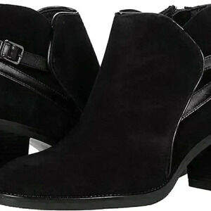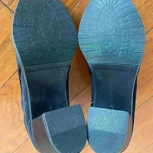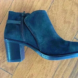 Ankle bootie with comfortable stacked heel. Suede upper. Inside zipper and leather lining. Synthetic sole