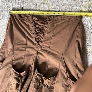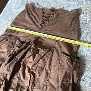 Cordelia Whimsical Corset Waist Full Skirt. Size XS. Chocolate brown color, 100% cotton. Full skirt midi length with pockets all over. Very cool and interesting design. Pull on style, see measurements.