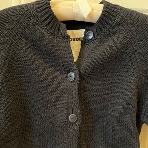 Cordera cropped button up top/sweater. 80% cotton, 20% ecotec PES. One size. Is true black. Have not worn this top, but did wash it upon purchase. It is a beautiful top, but is just a bit too cropped for me. See pictures for measurements. Please note that the last picture is just to show this top as worn on model, but in blue. My top is black.
