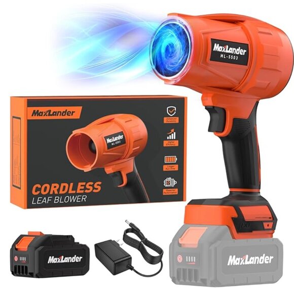 This battery blower with high-capacity 21V 3.0Ah batteries provides 20+ minutes of continuous runtime per charge