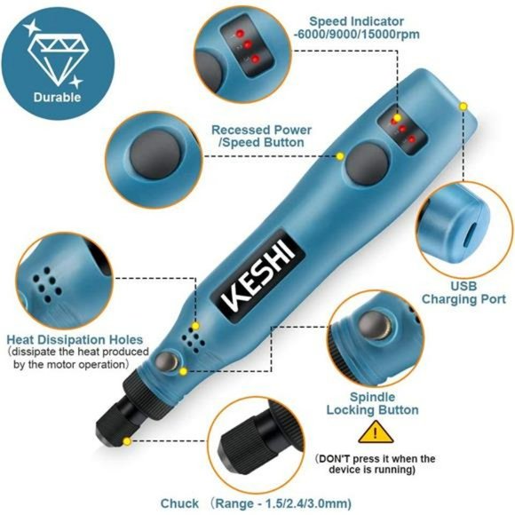 🧿[3 Powerful Speed Settings + Great Ventilation ]: 3 powerful speed selections with scattered vent holes. 5000 rpm all the way up to 15000 rpm speed that makes your artwork DIY creation a quite easy thing, while the vent holes on the body effectively dissipate the heat released when the power rotary tool is running, extending battery life for a long-term and safe use.