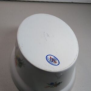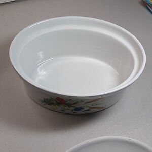 Elegant white ceramic casserole dish with colorful floral designs. Perfect for serving meals in style.