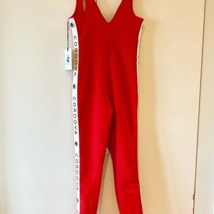 Cordova The Vail striped stretch stirrup ski suit.