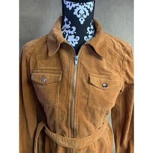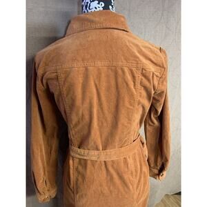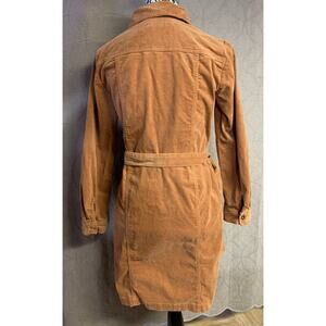 This pre-owned woman's dress by Metro Blues features a solid apricot corduroy fabric with a collared neckline, long sleeves, and a zip closure. The bodycon style dress has a midi length and offers stretch for comfort. It has a preppy, princess, and western theme, making it suitable for casual occasions in the winter, fall, or spring. The dress is ideal for those who appreciate indie fashion with a touch of sexy flair.