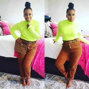 Tan corduroy pants, elastic band, side and back pockets, button fly, wide to tapered ankle. Very versatile. Looks super cute with heels or low top sneakers.