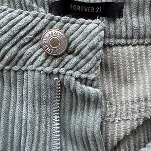 Features soft stretch corduroy fabric with a vertical ribbed texture. Classic 5-pocket design with two back patch pockets and three front pockets. High rise, wide leg silhouette. Zip fly with Forever 21 branded button at waist. Material tag not shown, but typical Forever 21 corduroy blend.