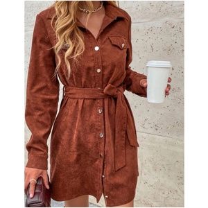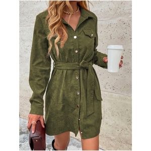 Corduroy dark Green Button Down Belted Long Sleeve Shirt Dress