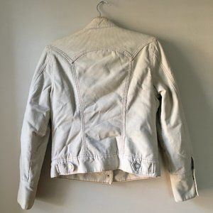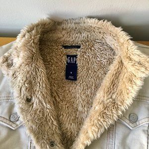 Cream colored corduroy coat from Gap with tan sherpa lining and brown contrast stitching. Snap closure. Very comfortable and warm, too! Excellent condition.