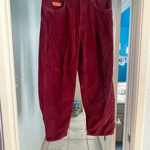 28” inseam, GMPYRE size 32 corduroy slacks. Cranberry color. Worn once only. They belonged to my granddaughter. Smoke free and pet free home. Bought at Zumiez Store.