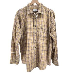 Corduroy Button Up Shirt Long Sleeve SUPER Distressed Tan Lavender Plaid | Large